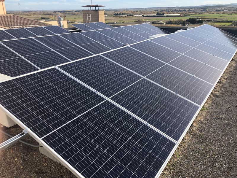 Instalación fotovoltaica de 12,8 kW en ayuntamiento de Villanueva de Gállego. Proyecto, ejecución y tramitaciones para autoconsumo. Módulos monocristalinos e inversor Huawei. Compensación de energía.